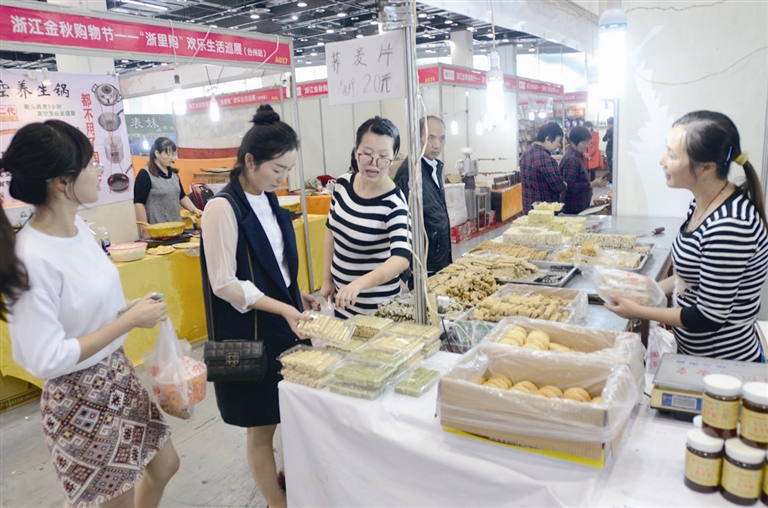 10月8日至15日,金秋购物节“浙里购”欢乐生活巡展在台州国际会展中心举办。展会上不仅有化妆品、工艺品、家纺等生活用品,还有来自全国各地的特色食品。据在场购物的市民反映,此次购物节参展的商品价格比超市、批发商那里的还要便宜,有的市民在购物节期间已多次前来购物。