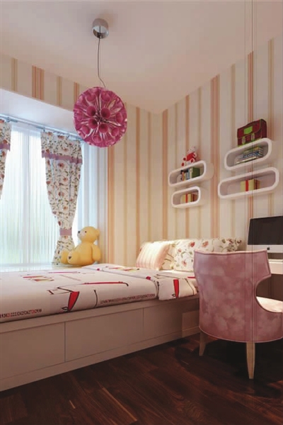 对于儿童房,徐女士女儿一度坚持要用Hello Kitty的壁纸,结果被设计师无情地否定了,建议使用色彩明快的壁纸,最多以卡通腰线加以点缀。再“过分”点的话,就是采用上下搭配的方法,即使用上部带卡通图案,下部素条或素色的壁纸,营造出快乐整洁的效果。其实设计师此言并非无理,在许多儿童样板房图案中,大多是采用个性化叠床或是吊床的设计,而且是主题鲜明,因而用纯卡通壁纸一点都不为过。但现实之中,儿童房面积、高度均不理想,根本达不到样板房效果,而叠床等另类家具不适宜不断成长的孩子,其个性化壁纸也会随着孩子的成长而被淘汰。
