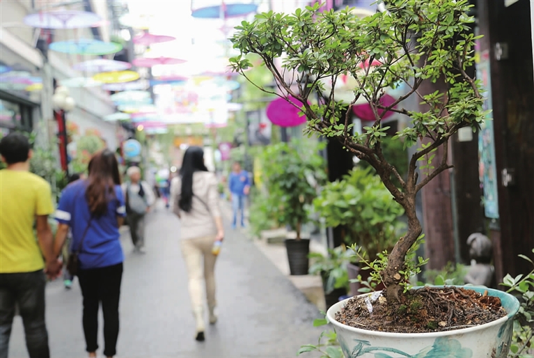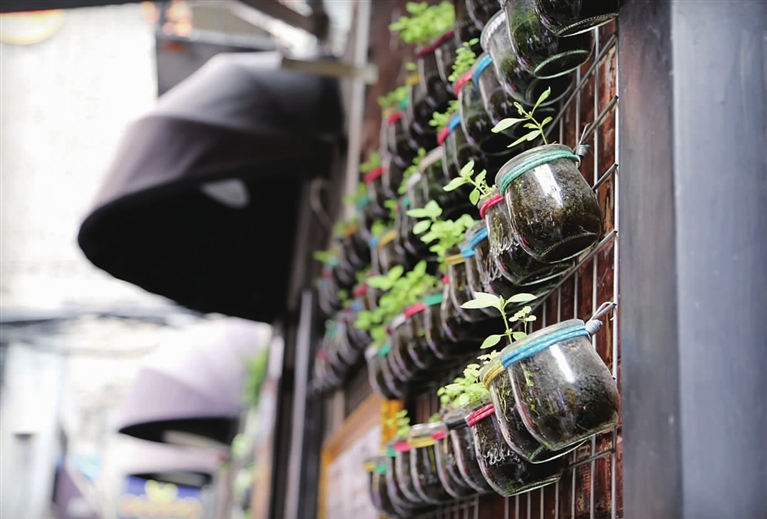 此外,你还可以在这里随时遇见满眼的绿植,一抹抹的绿意挂满墙面,蔓延街角,并徜徉到你心底。再加上几分暖意,几丝微风,足以慵懒一颗心,柔软一段蹁跹时光。若走累了,找个安静的小楼,点杯咖啡,透过玻璃窗远眺这窄窄的小巷,感慨这“偷得浮生半日闲”。