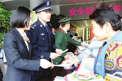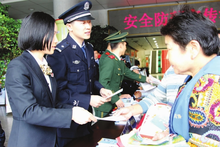 11月4日,公安分局组织刑侦、经侦、交警、消防等部门,并会同金融单位,在人流量较大的中国日用品商城开展了心防宣传教育活动。 本报通讯员 蒋友亲 摄