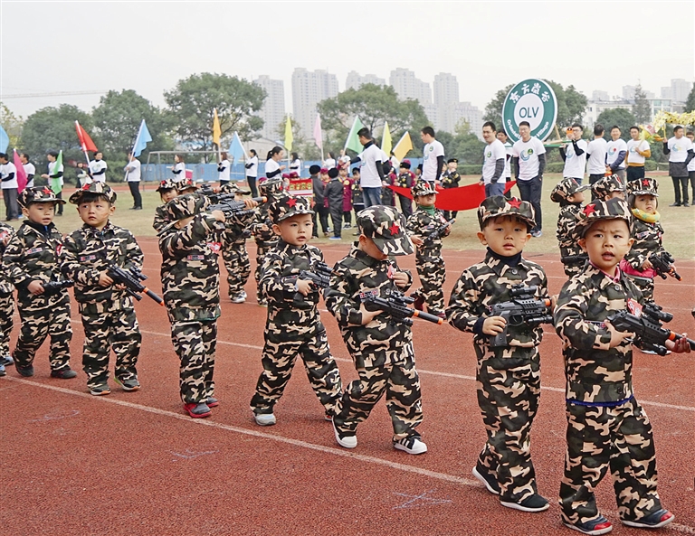 日前,东方岚谷幼儿园的小朋友身着“海陆空”服饰,参加学校一年一度的亲子运动会,让人耳目一新。
