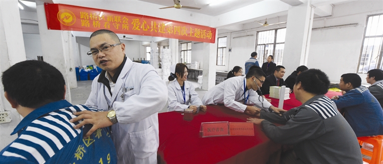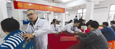 12月9日,台州章氏骨伤医院的医生为看守所在押人员诊断健康状况。当日,新的社会阶层人士联谊会组织人员来到看守所举行以“共搭爱心桥、迈向新生活”爱心共建为主题的帮扶活动,为在押人员开展义务法律咨询、心理辅导、义诊及赠送法律书籍等。
