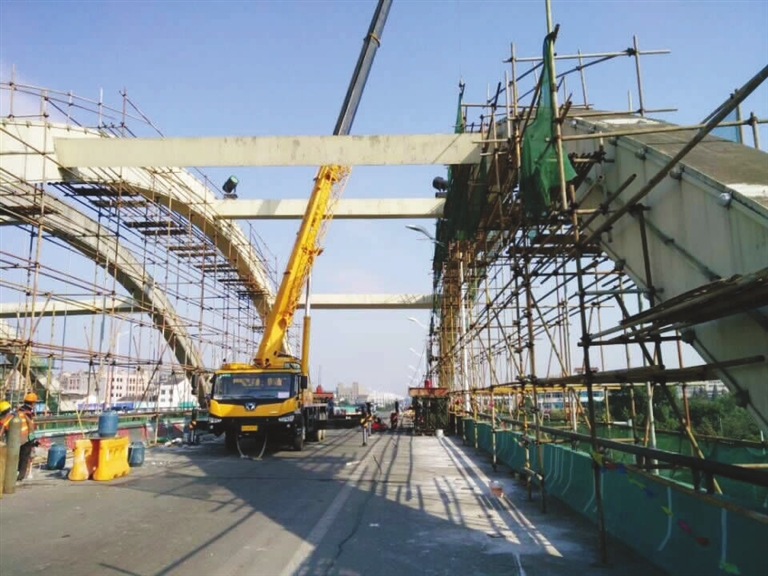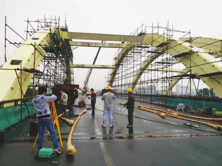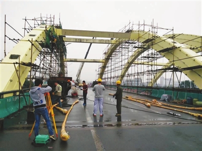 系杆拱桥的吊杆质量非常重要,它不仅承担着桥梁本身的重量,还要承受往来车辆的重量,因此吊杆更换的工程需要更小心谨慎。“吊杆更换不能将全部旧吊杆拆除,否则桥梁就会垮塌。”朱海波介绍,在施工过程中,他们要先将更换某个旧吊杆拆除,把它的承受力平均分配给左右两根吊杆,然后再将新吊杆安装上去。整桥吊杆更换完后,再对索力进行调整。为了保证施工质量,该局还专门聘请了检测单位,对施工全程的荷载、标高等数据进行检测。