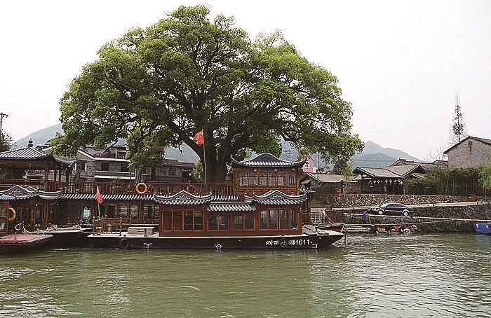 从古街出来,雨已停。来到船埠头,我们排着队,上了仿古亭台型游船。据导游介绍,这些渡轮大的能载客七八十人,小的能容四十人。画乡与古堰之间仅十多分钟的路程。岸渐离渐远,岸边葱郁的树慢慢后退,我们从大港头镇来到堰头镇。一路上,穿竹林,沿溪涧,走木廊,跨溪石。女儿雀跃着扑向大自然的环抱,大红色的蝴蝶结配着米奇头像的连衣裙,在绿色中穿梭,犹如一只花蝴蝶。