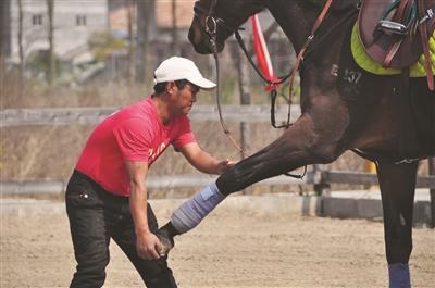 这时,出现在记者眼前的是一位皮肤黝黑的年轻小伙,红色T恤、黑色裤子、长筒袜、黑色皮靴。只见他从马厩里牵出那匹名叫“风暴”的马来到马厩旁的水泥地上,将绑腿打在马的脚踝关节上方的胫骨处,再为其装上马鞍、脚蹬、肚带、缰绳等装备。走上小型沙场,小伙先对马进行腿部拉伸,然后一蹬,一转身,坐上马背,在他熟练的操控下,“风暴”开始迎风奔跑起来,无论是姿势、力道还是速度,都不难看出小伙与“风暴”一样,“久经沙场”。