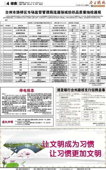 台州市路桥区市场监督管理局流通领域纺织品质量抽检通报