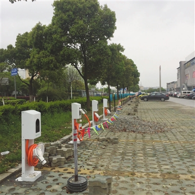 4月5日,家住台州国际塑料城附近的市民王先生向本报反映,塑料城门口的停车场最前端,不久前多出了一排看着陌生的设备。“外型和路边的停车计时器倒是很像,有二三十个,正对着汽车停车的位置。”王先生还发现,每个设备上都连接着一个类似汽车加油枪的部件,这让他对这些设备的用途感到十分好奇。