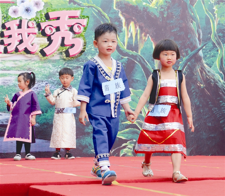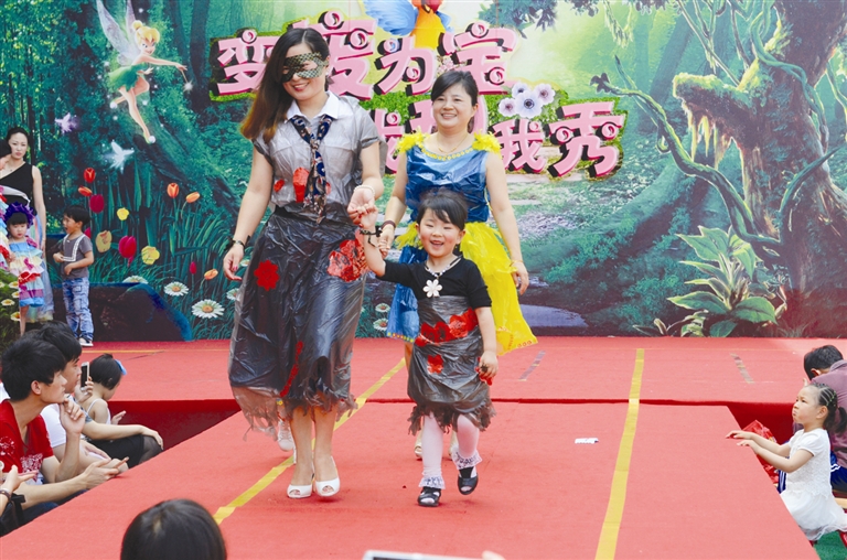 活动前,孩子们和老师一起收集各种废旧材料,在每天的区域活动中,进行巧妙、具有创意地制作,做成了各式各样的环保服装。废弃的光盘、水果包装网、一个个破旧的杯子,甚至包括平时最常见的环保袋、塑料袋、包装盒、报纸、布袋等,在家长和孩子们的精心设计和制作下,变成了漂亮别致的蛋糕裙、民族服装、帽子、套装……在欢快的节奏乐中,家长和孩子们迈着自信、优美的台步走来了,大家出色的表演,加上炫丽的服装,吸引了在场所有人的目光,赢得了阵阵掌声。