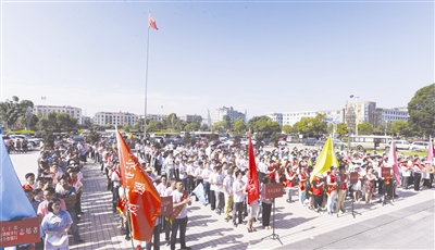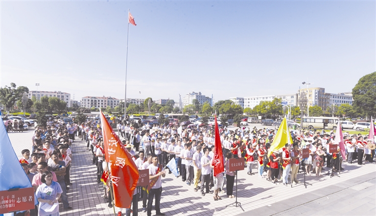 参加推进大会的人们顶着炎炎烈日,立正站好,放眼望去并不难分辨他们的“角色”。大学生村官、各村团支部书记、各村妇委会成员、党员志愿者、机关干部等将近500人,分成巾帼志愿者、青年志愿者、夕阳红志愿者、党员志愿者、平安护航G20志愿者等,在助推“美丽金清行动”过程中,他们各有使命与任务。