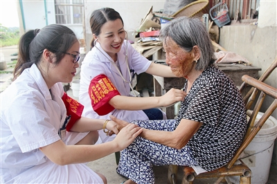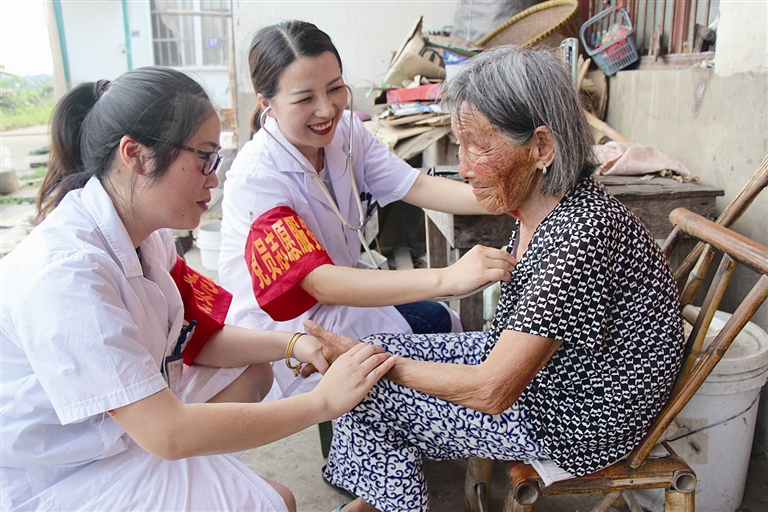 6月23日,路南街道社区卫生服务中心的6名党员志愿者,冒着高温,携带便携式医疗器械,来到南岸、长浦等村(居)开展义诊献爱心活动,受到了当地群众的交口称赞。 本报通讯员 林宝聪 罗永祥 摄