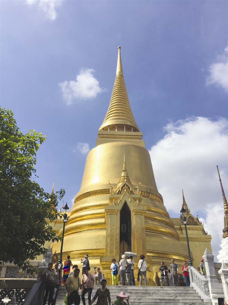 说起佛教,就不能不提起大皇宫。大皇宫是泰国诸多王宫之一,也是一座有着深刻象征意义的皇宫,曼谷王朝从拉玛一世到拉玛八世,大皇宫都是皇室人员的寝宫,据说自从1946年拉玛八世在宫中被刺之后,拉玛九世便搬至新宫居住。现在的大皇宫仅用于举行加冕典礼、宫廷庆祝等仪式,象征意义大过使用意义。大皇宫现在是泰国旅游的标配项目,由此带来的弊端便是人太多,熙熙攘攘,让人连个落脚的地方都没有。我建议散客淡季出行,并选择早上八点半开门,或者下午四点半关门这两个时间点去游览,可能见到的佛头会比人头要多一点。对泰国佛教感兴趣的游客不妨在大皇宫里待久一点,看看壁画听听故事,也挺有意思。