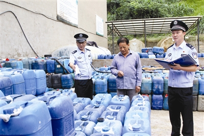 公安分局严加对易制毒化学品的规范管理,通过严把审批、储存、销售等各个环节,定期或不定期开展明查暗访,确保易制毒化学品不流入非法渠道。图为10月18日上午禁毒大队民警正在对易制毒化学品储存、销售点进行例行检查。