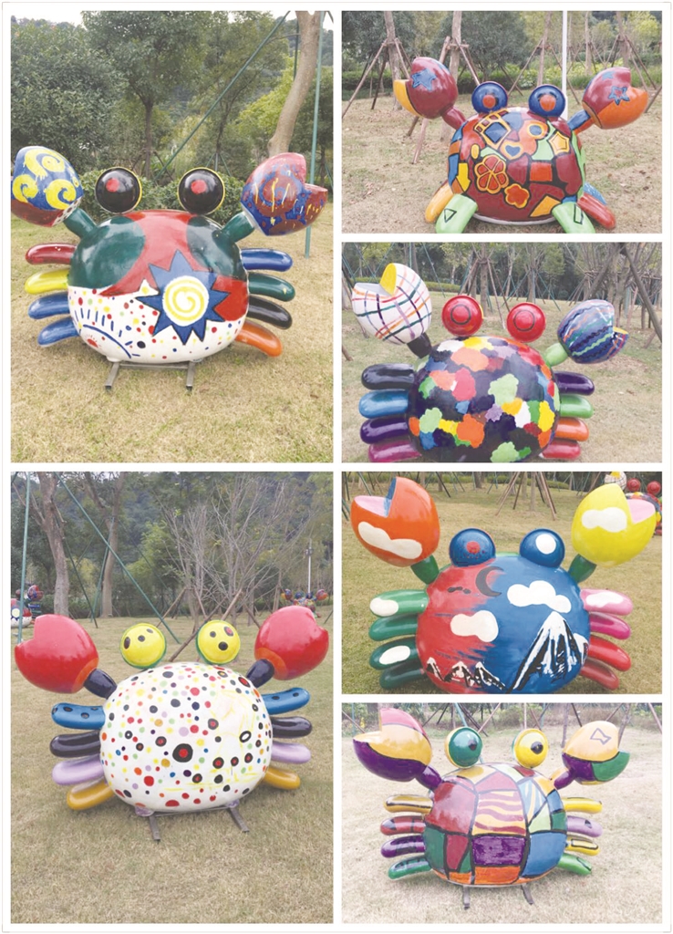 在中央山公园二期,记者看到了此次展览的6只螃蟹,它们身上或是画着云朵,或是画着五角星、心形,螃蟹的钳子上还画了累似西瓜皮的图案,展示出台州小朋友们丰富的想象力。