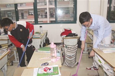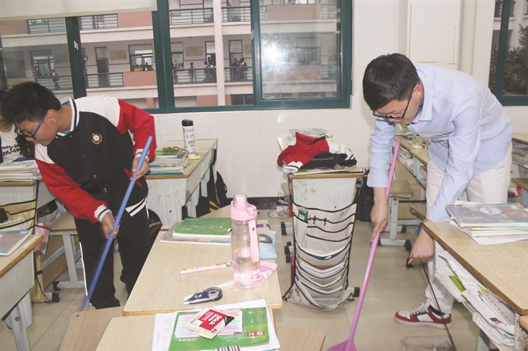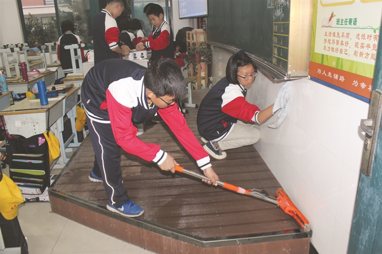 下午第三节课后,学生们在班主任的带领下,拿起扫帚、拖把、铲子等劳动工具,对教学楼走廊、楼梯、教室、寝室、操场等进行清扫,特别是对校园卫生死角、绿化带等进行了认真清扫。打扫天花板等高难度地方时,娇小的学生们站在凳子上变身“巨人”,同学们则用双手去扶住凳子,给予他最强大的安全感。