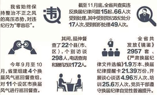据省委组织部介绍,从督查情况看,各地认真落实“四必看”“四必谈”“四必训”要求,抓好换届纪律教育培训,全省共发放《镜鉴》2957套、《严肃换届纪律文件选编》1.9万本、换届纪律提醒卡21.39万份,开展谈心谈话4.96万人次、培训25.6万人次,党员干部遵守换届纪律自觉性普遍提升。市县两级396个巡回督查组全程督查换届风气,一些档案存疑、廉政审核未通过、瞒报个人有关事项的干部被取消提拔资格或不再继续提名,违反换届纪律问题被及时查处通报,起到了较好的警示和震慑作用。