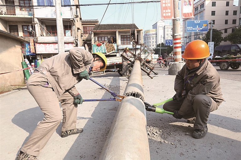 “拆除废旧电线杆费时费力,电力工人们花了一个小时,才将这根12米长的废旧电线杆缓缓放倒。”路桥供电公司运维部的工作人员说,“拆下的电线杆从架设到现在已经十几年了,拆下时电线杆底部已有裂痕,顶部的铁横担经过风吹雨打早已生锈。今年下半年城区电网线路优化后,已经将所有线路移位到了旁边的A4号杆。”