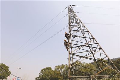 近日,供电公司高空作业人员在35千伏枫升线上安装避雷线,为即将到来的雷雨季节安全防雷做好准备。