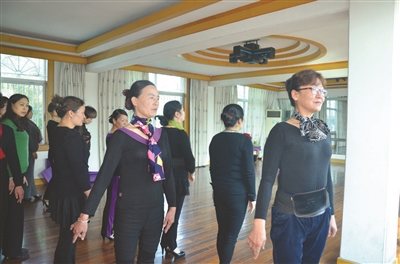 未见其人先闻其声,3楼未到,先听到脚掌落地的“哒哒”声。身材高挑、身段玲珑的30多名“阿姨”学员迈着步子,缓缓前行。“挺胸,感觉头顶有一根线牵着……”马艳梅老师在一旁指导着。