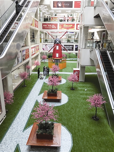 近日,记者在走访时发现,中国日用品商城里有个“十里桃林”。桃花、风车、小桥…吸引着消费者们的眼球。据悉,该处面积有500平方米,位于负一楼A区和B区之间的中庭。本报记者 蔡 聪 摄