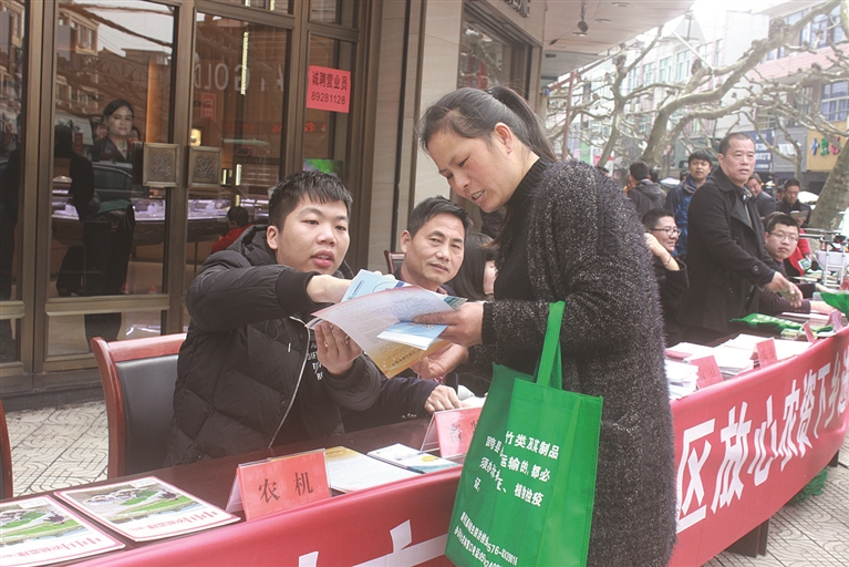 日前,在金清镇金林路与人民路交叉口,台州市暨路桥区放心农资下乡进村宣传活动,吸引着路人前往咨询。当天,农机、畜牧、农产品、农经、农技、林特、法规等农业相关部门,以及市、区两级农业行政执法相关工作人员等,在现场提供咨询服务,并对过期农药进行回收。此外,农资公司还在现场为农民答疑解惑。 本报记者 梁佳 摄