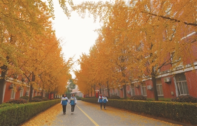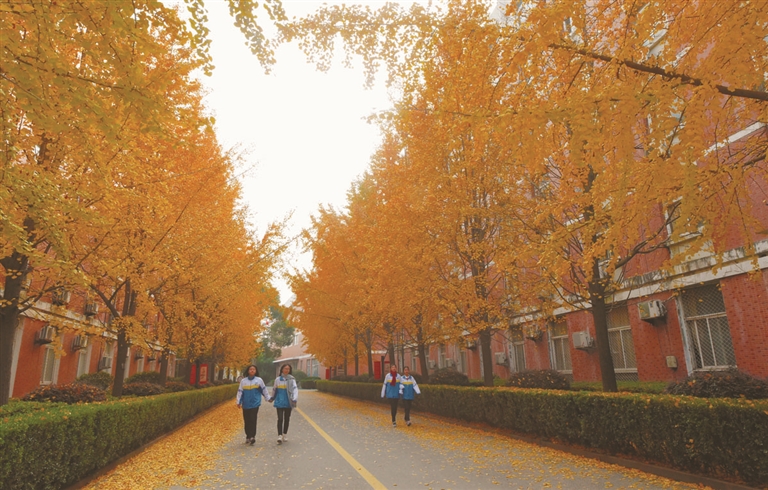 12月5日上午,路桥中学的学生在银杏树下散步,感受金色之美。眼下,该校成片的银杏树、无患子树黄了,落叶铺就了一道道美丽的“黄金线”。 全媒体记者 王保初 摄