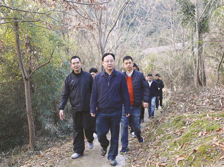 2017年12月31日,区委书记潘建华率区规划、区农林局、飞龙湖管委会、桐屿街道等相关单位主要负责人,徒步凉溪古道,实地调研凉溪古道开发建设。区委常委陈庆中参加调研。