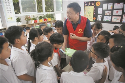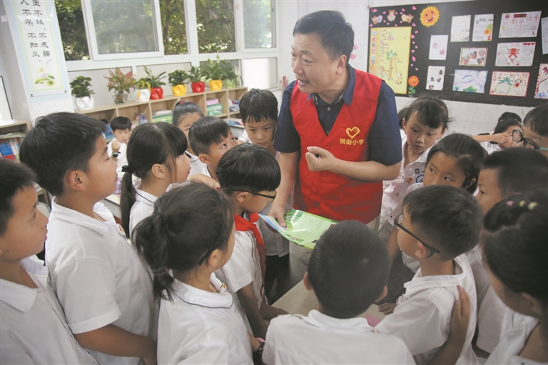 6月26日上午,横街镇环卫所联合该镇中心小学共同开展垃圾分类知识进校园宣传活动,向学生们传授垃圾分类知识,培养他们的垃圾分类回收处理意识,进而带动身边的人做好垃圾减量和垃圾分类,自觉履行保护环境的义务。图为环保志愿者向孩子们宣讲生活垃圾如何进行分类等知识。