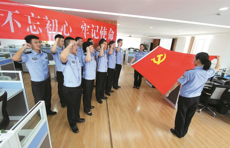近日,区公安分局情指联勤中心党员民警们在岗位上重温入党誓词,筑牢忠诚本色。