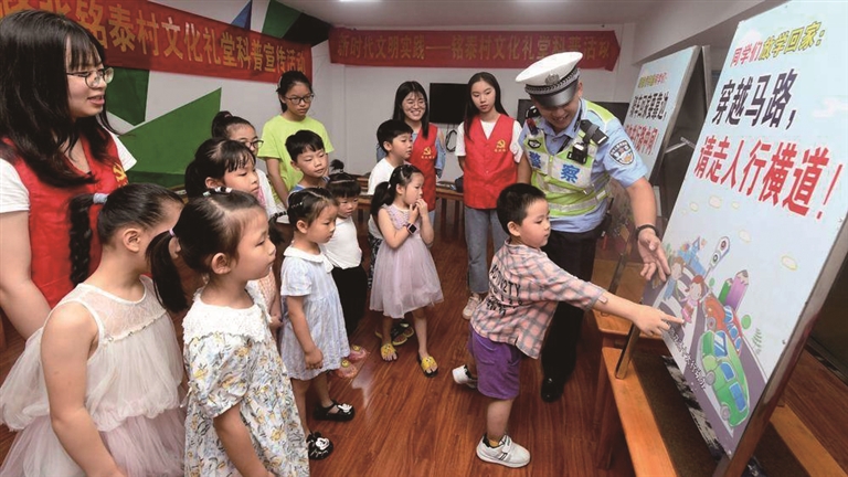 7月8日,路北街道铭泰村的20多位留守孩子,正在认真听交警讲解出行交通安全常识。当日,路北街道党员志愿者、纪检干部和公安交警来到该村文化礼堂,开展“护航学生暑期安全”活动,给这群留守孩子上了一堂关于防溺水、防诈骗等内容的暑假安全知识课。