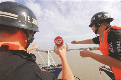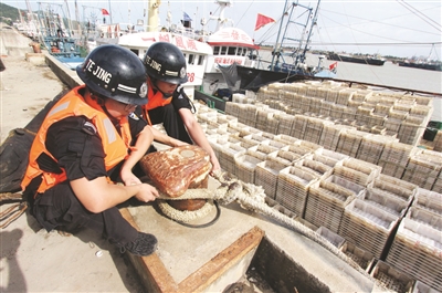 8月4日凌晨,今年第4号台风“黑格比”登陆乐清,同时,给我区带来了狂风暴雨。台风登陆前后,全区公安机关和广大民警、辅警在区委、区政府的统一指挥部署下,全力奋战在防台第一线,守护人民群众的生命财产安全。图为8月3日下午,特警在金清镇渔港码头帮助加固渔船,撤离船上人员。