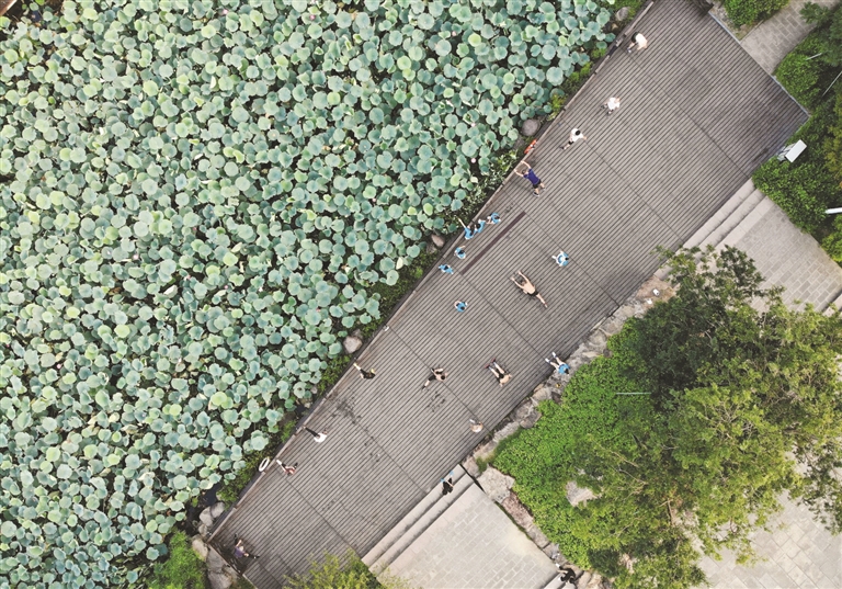 8月18日,在中央山公园内,市民正在荷池边晨练。近年来,我区合理开展城市公园建设,一方面科学规划各类主题公园,一方面充分利用城市边角地开展“口袋公园”建设,不断提升城市的生态环境和市民的获得感。