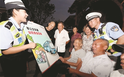 8月19日傍晚,路南街道西夏新村村民正在认真听交警讲解交通安全知识。当晚,市交通警察局直属三大队一中队的交警,来到公路沿线村居的文化广场和公园,为正在乘凉的村民送上一堂通俗易懂的安全课,倡导大家文明出行。
