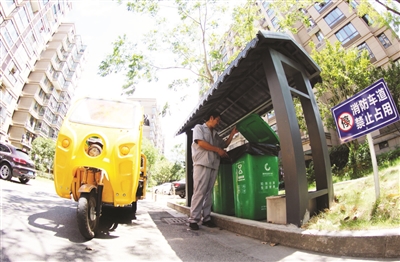 为提升城市形象,方便群众进行垃圾分类,路南街道秀水名苑小区为垃圾桶存放点建起统一格式的“小凉亭”。图为8月23日,居民正在分类投放垃圾。