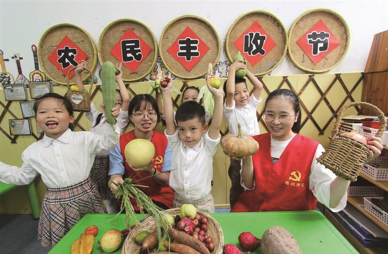 9月22日是二十四节气中的秋分,是我国第3个“农民丰收节”。9月21日,路北街道组织党员志愿者走进中小学校及幼儿园,把“农民丰收节”办到校园课堂上,与学生一起分享劳动的喜悦,让学生厉行节约、尊重农民劳动成果。图为路北街道的党员志愿者正在水天一色小区幼儿园开展宣传。